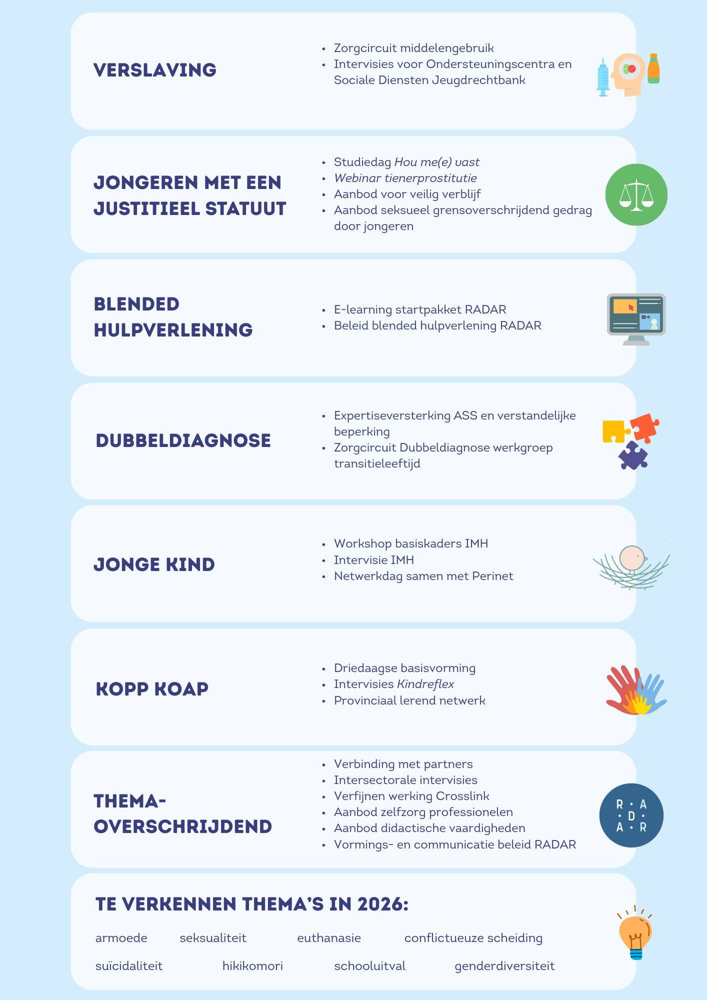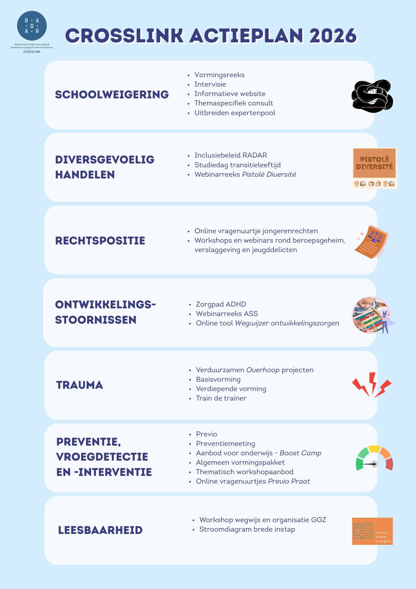Crosslink versterkt professionelen die werken met kinderen, jongeren en hun gezinnen in hun rol rond geestelijke gezondheid door in te zetten op drie opdrachten:
