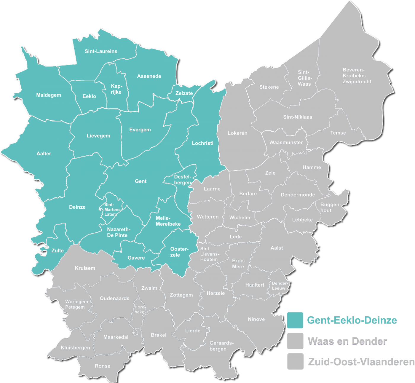 Belangrijk: De proeftuin jonge kind richt zich tot jonge kinderen met vindplaats in de regio in de regio Gent-Eeklo-Deinze. Het proeftuinproject loopt niet in de regio's Waas en Dender en Zuid-Oost-Vlaanderen (zie kaartje hieronder).